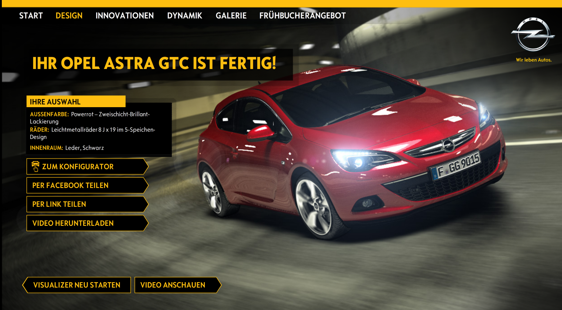 Am Ende hat der User so ein Video mit seinem individuell konfigurierten Opel Astra GTC und kann den selbst konfigurierten Film downloaden oder ihn auf Social-Media-Plattformen sharen. Die Konfiguration während der Fahrt wird durch den „virtuellen Visualizer“ ermöglicht, den MRM worldwide realisiert hat. DDD hat mit Hilfe der von Impossible Software entwickelten Echtzeit-Videotechnologie die individuelle Videoerstellung übernommen.