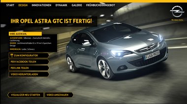 Vor der Produkteinführung des neuen Opel Astra GTC wird ein Konfigurator gewünscht, der das Fahrzeug während der Fahrt verändern kann und dies in einem laufenden Film zeigt. Der User soll sich auf diese Weise schon vor Verkaufsstart sein Traumauto virtuell zusammenstellen und es in Aktion sehen können.