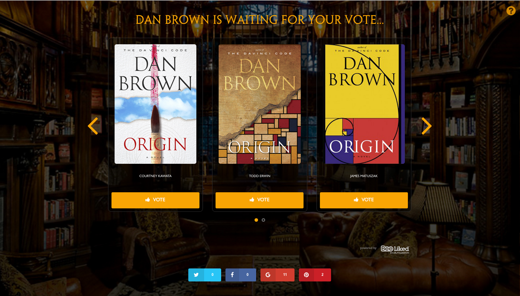 Für das neue Buch des ‘Da-Vinci-Code’ Autor Dan Brown sollte in der Zeit von Mai bis Juni 2017 ein Cover-Voting und gleichzeitigem Gewinnspiel veranstaltet werden. Der Teilnehmer dieses Gewinnspiels konnte eines von sechs Buchcovern auswählen und erhielt dann ein persönliches Video.