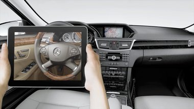 Der 360°-Explorer ermöglicht eine Rundumsicht des gesamten Interieurs, bei der alle möglichen Innenfarben und Polster virtuell erlebt werden können. So sitzt man z.B. in einem Fahrzeug mit dunklen Lederpolstern und kann auf dem iPad sehen, wie diese als helle Stoffausstattung aussehen würden.