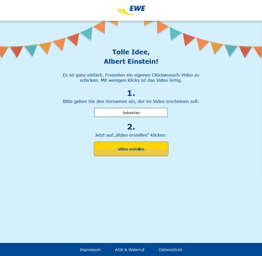 Ziel des Projekts war es, eine Plattform zu schaffen, über die es möglich ist, datenbankgetriebe Geburtstagsgrußvideos für die EWE Kundschaft zu erstellen und jene automatisiert an diese per Grußmail inkl. eingebettetem Link zum Videoclip auszuliefern. Der Mailversand erfolgte dann über die Agentur „Rabbit“ ebenso automatisiert an dem Geburtstag des Kunden.