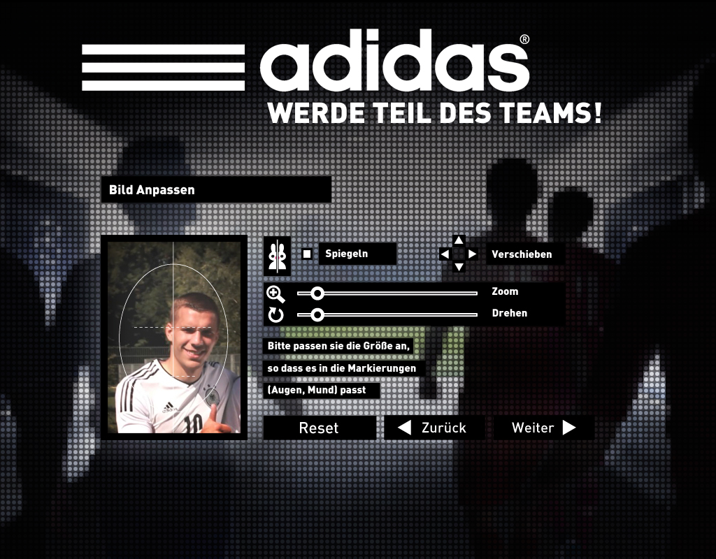 Um die sehr aufwending gefilmte Hauptkampagne von adidas soll ein viraler Spot erstellt werden, der es dem User ermöglicht, Teil der deutschen Nationalmannschaft zu werden.