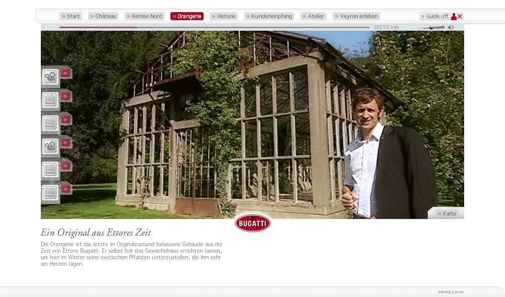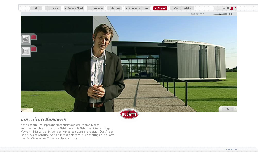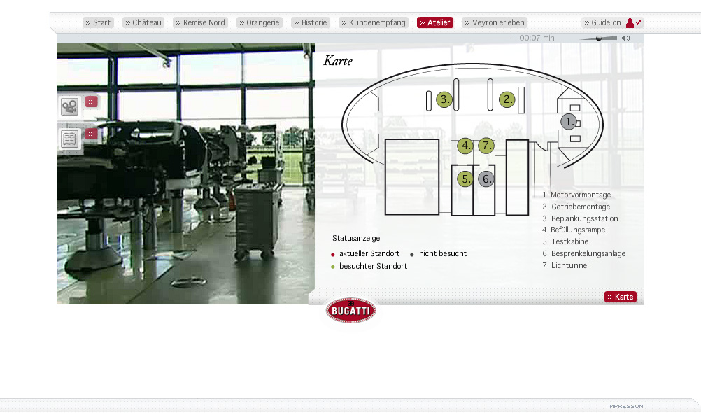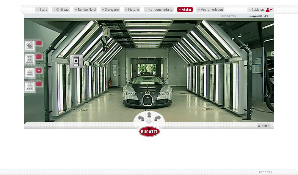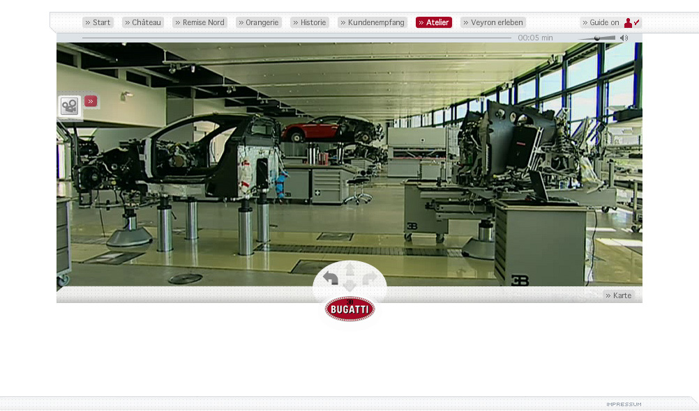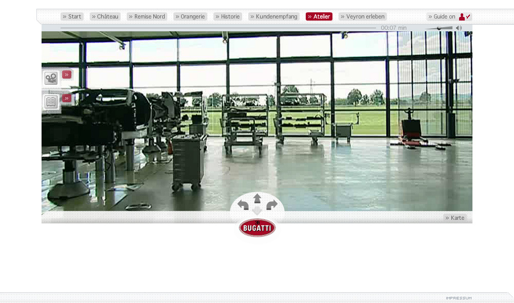 Der virtuelle Rundgang zeigt den Besuchern durch neue, von DDD produzierte Filme weitestgehend das gleiche exklusive Ambiente wie in der Realität. Dabei wird sowohl ein Blick von außen, als auch in die einzelnen Gebäude gewährt. Zudem sieht der User zeitgenössische Fotografien und bekommt detaillierte Hintergrundinformationen zur Geschichte der Marke und Fabrikation des Bugatti Veyron in den Sprachen Deutsch, Englisch und Französisch – auf Wunsch gibt es eine Guided-Tour.