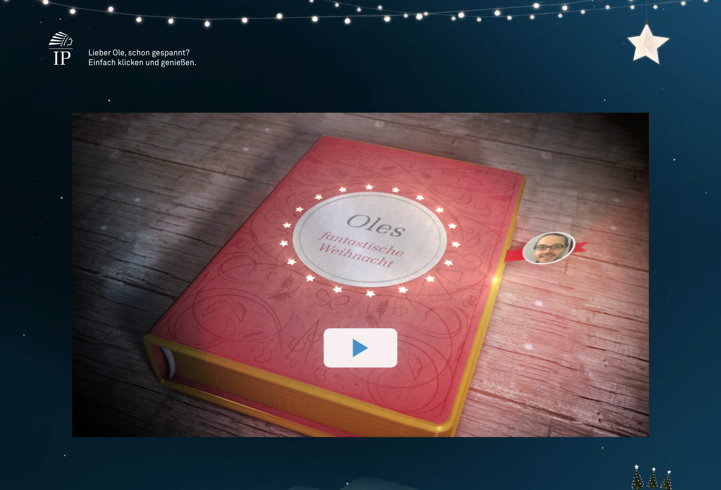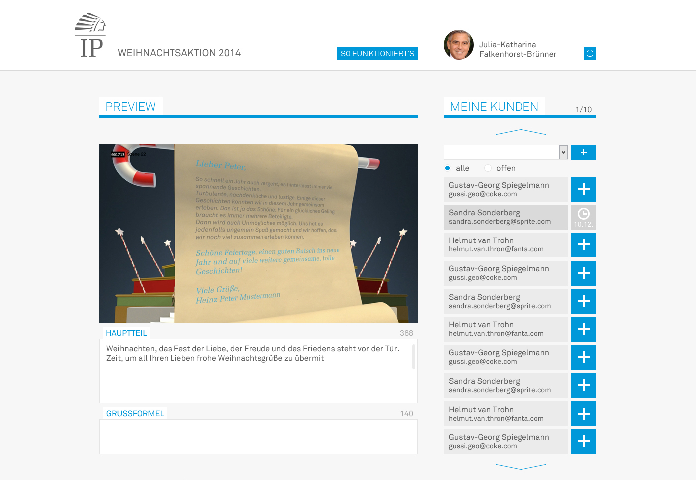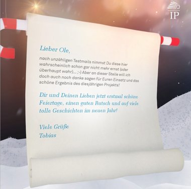 IP Deutschland für den diesjährigen Weihnachtsgruß so erweitert, dass der Versender bestimmen konnte, zu welchem Datum genau seine Nachricht und der Gruß versendet werden sollen. So hatten die Mitarbeiter der IP Deutschland die Möglichkeit, schon ab Anfang Dezember ihre persönlichen Wünsche zu erstellen. Der Versand fand dann erst zwischen dem 08.12. bis zum 16.12. statt.