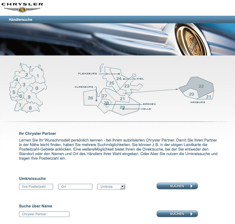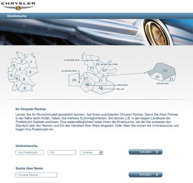 Um einen der deutschen Chrysler Partner in der Nähe oder in einer anderen Stadt zu finden, steht die einfache und übersichtlich gestaltete Händlersuche bereit. Dabei kann der User per Fahrt mit der Maus über die Deutschlandkarte oder über Direktsuche den gewünschten Händler finden. Bei der Direktsuche wird entweder der Standort oder der Name und Ort des Händlers der Wahl eingegeben. Oder man nutzt die Umkreissuche und trägt die entsprechende Postleitzahl ein. Für die direkte Kontaktaufnahme werden dem User detaillierte Informationen mit Anschrift, Telefon und Servicebereich des Händlers angezeigt. Außerdem ist der direkte Link der Händlerwebseite mit in der Liste zu sehen.