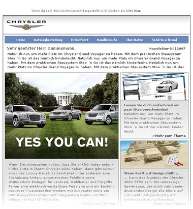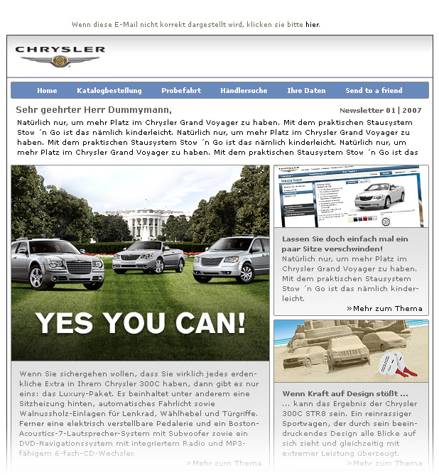 Um die Interessenten der Marke Chrysler immer auf dem Laufenden zu halten, wird der Newsletter ins Leben gerufen. Der Interessent hat über die Webseite die Möglichkeit sich für diesen Newsletter anzumelden damit er immer auf dem Laufenden bleibt. Dabei kann es sich um Aktions-Newsletter handeln, die gezielt auf nur einen Termin bzw. ein Event hinweisen oder um einen allgemein informierenden Newsletter, der mehrere Meldungen beinhaltet. Die meisten News sind für mehr Informationen mit entsprechenden Themen auf der Website verlinkt.