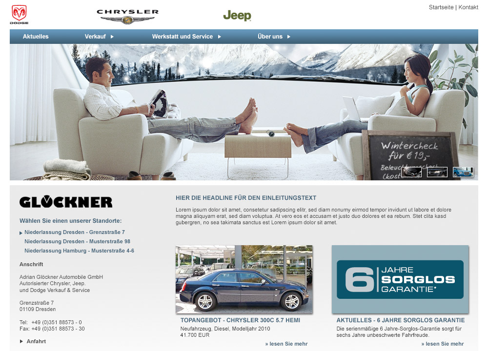 In Specials und Online-Newslettern wird zudem über Aktionen, Sondermodelle oder Termine informiert. DDD ist ebenfalls für den jeweils individuell zu gestaltenden Auftritt der Chrysler Händler verantwortlich.