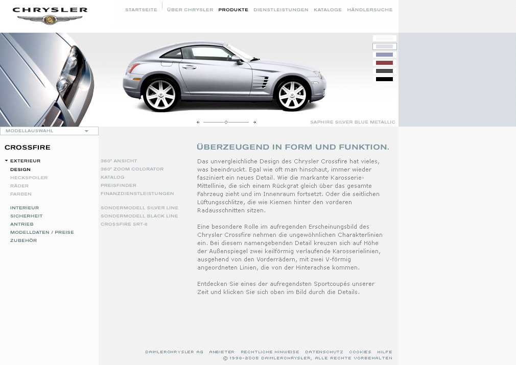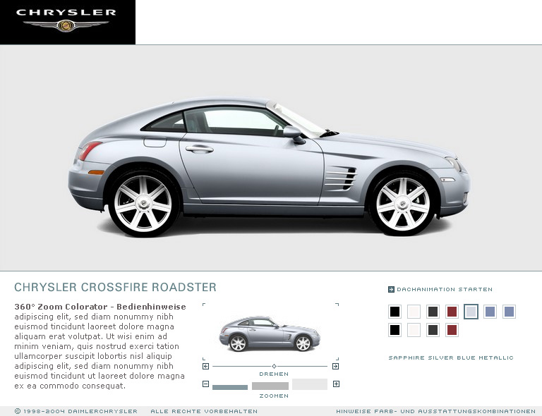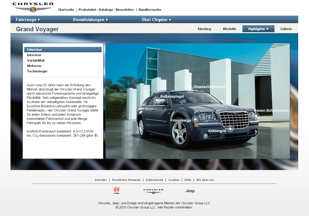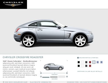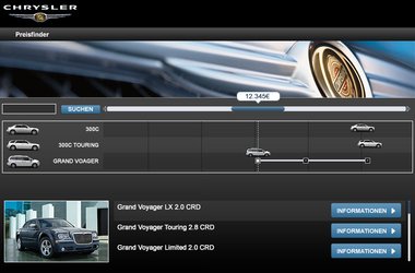 Mit diesem innovativen Tool gelingt es, eine interaktive Applikation zu schaffen, die ohne lange Ladezeiten eine erlebbare Produktdarstellung im Web möglich macht. Intuitive Benutzerführung und kurze Ladezeiten machen den Besuch auf chrysler.de besonders userfreundlich.