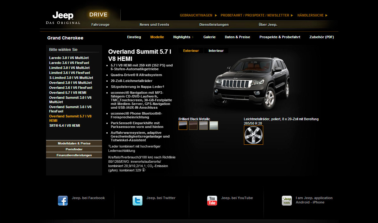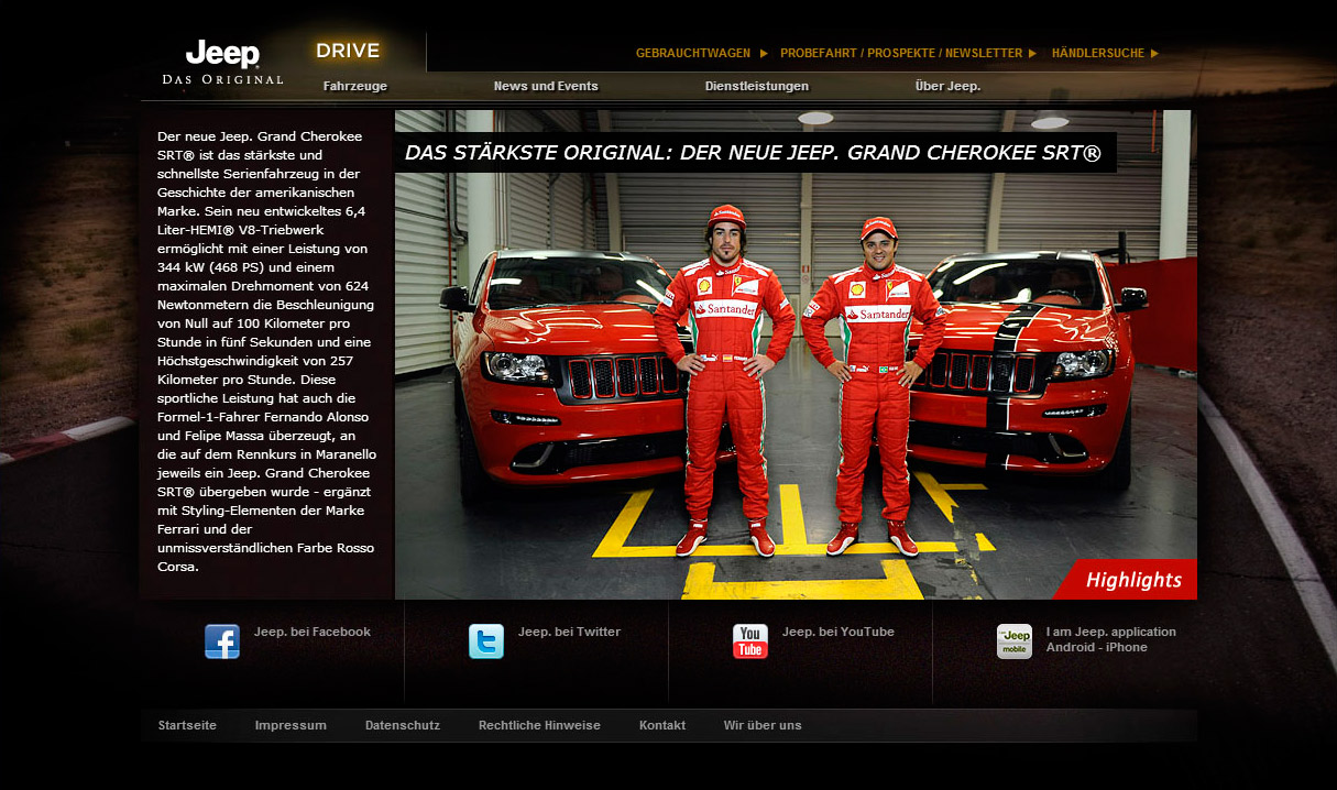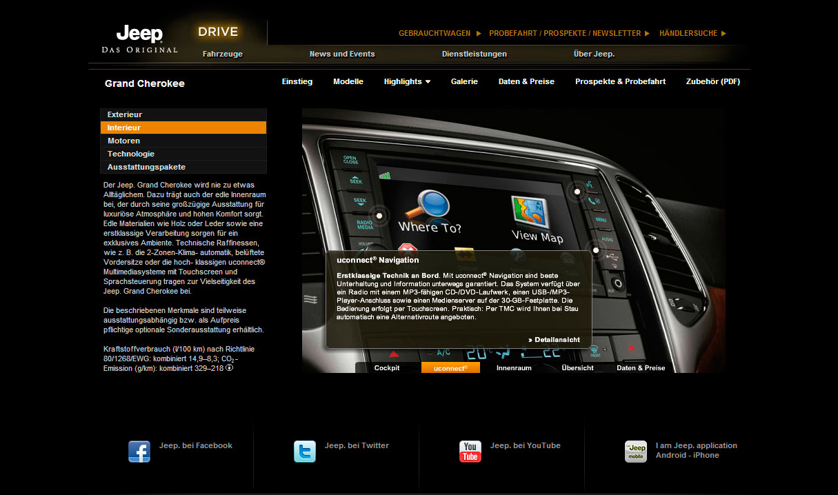 Auch die Finanzdienste, das Flottenmanagement und eine Gebrauchtwagensuche sind über jeep.de zu erreichen. Die Rubrik „Über Jeep“ geht auf die Historie der Marke ein, zeigt Concept Cars und enthält Information zum Thema Umwelt.