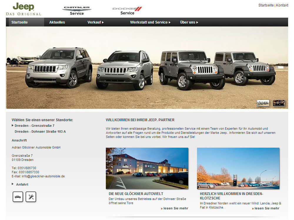 Um einen der deutschen Jeep Partner in der Nähe oder in einer anderen Stadt zu finden, steht die einfache und übersichtlich gestaltete Händlersuche bereit. Dabei kann der User per Fahrt mit der Maus über die Deutschlandkarte oder über Direktsuche den gewünschten Händler finden. Bei der Direktsuche wird entweder der Standort oder der Namen und Ort des Händlers der Wahl eingegeben. Oder man nutzt die Umkreissuche und trägt die entsprechende Postleitzahl ein. Für die direkte Kontaktaufnahme werden dem User detaillierte Informationen mit Anschrift, Telefon und Servicebereich des Händlers angezeigt. Außerdem ist der direkte Link der Händlerwebseite mit in der Liste zu sehen.