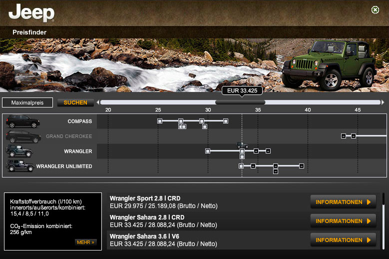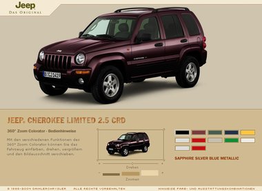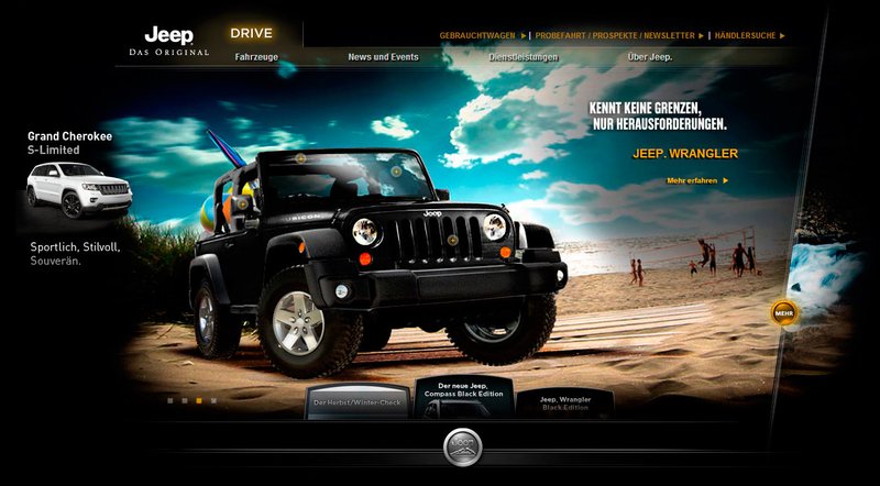 Mit diesem innovativen Tool gelingt es, eine interaktive Applikation zu schaffen, die ohne lange Ladezeiten eine erlebbare Produktdarstellung im Web möglich macht. Intuitive Benutzerführung und kurze Ladezeiten machen den Besuch auf jeep.de besonders userfreundlich.