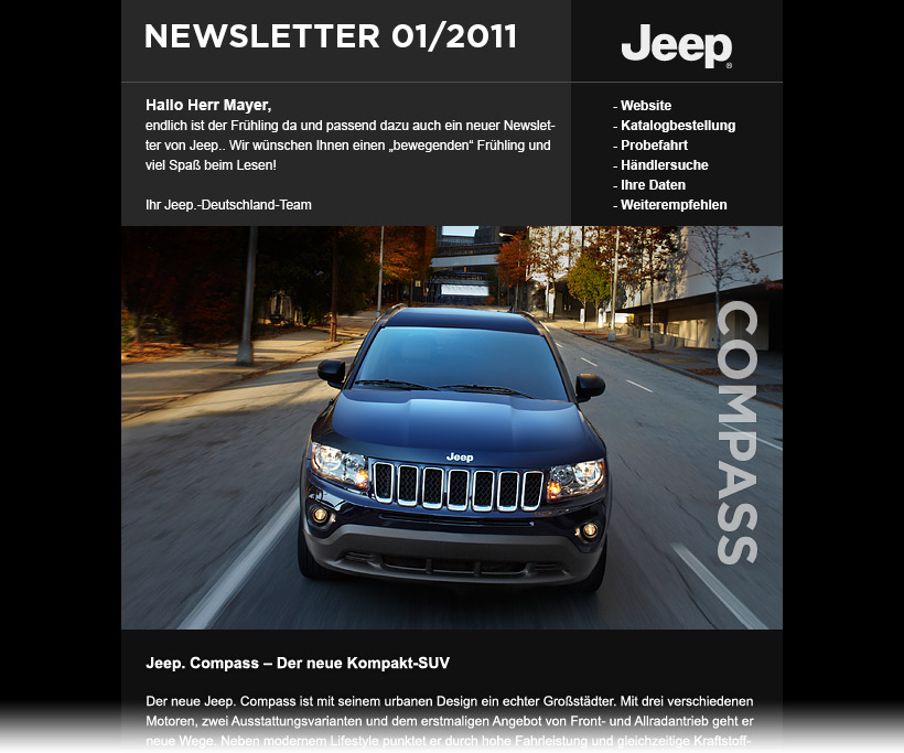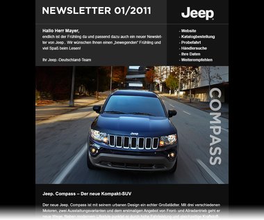 Um die Jeep Freunde immer auf dem Laufenden zu halten, wird der Newsletter ins Leben gerufen. Der Interessent hat über die Webseite die Möglichkeit sich für diesen Newsletter anzumelden damit er immer auf dem Laufenden bleibt. Dabei kann es sich um Aktions-Newsletter handeln, die gezielt auf nur einen Termin bzw. ein Event hinweisen oder um einen allgemein informierenden Newsletter, der mehrere Meldungen beinhaltet. Die meisten News sind für mehr Informationen mit entsprechenden Themen auf der Website verlinkt.