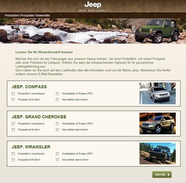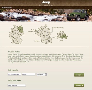 Als Dialoge stehen auf jeep.de das Abonnieren des Newsletters, das Bestellen von Katalogen und die Vereinbarung einer Probefahrt zur Verfügung. Einen besonderen Stellenwert hat die eigens für Jeep Partner konzipierte Händlersuche.