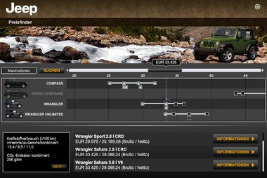 Der von DDD entwickelte Preisfinder bietet dem User die Möglichkeit, schnell zu sehen, wie viel das von ihm zuvor zusammengestellte Fahrzeug kostet. Das gilt für die aktuelle Fahrzeugkonfiguration als auch für Preisvergleiche mit alternativen Ausstattungen und Modellen. Besonders innovativ ist dabei die Wahl nach dem persönlichen Budget. Durch die Verschiebung des Markers auf einer Budgetskala werden die entsprechenden Typen und Ausstattungen angezeigt. Die übersichtliche Darstellung zeigt, welches Modell zum Budget passt und welches darunter oder darüber liegt.