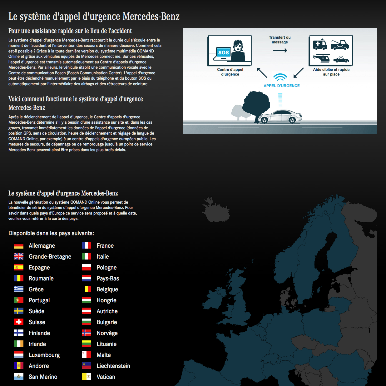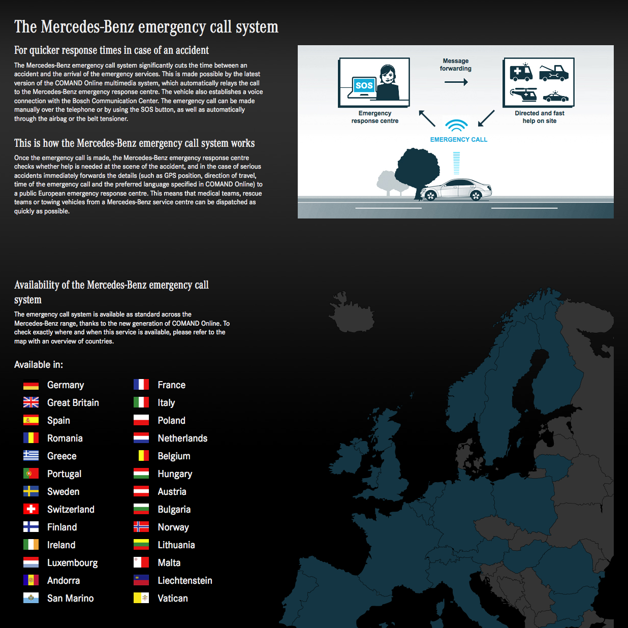 Eines unserer Mercedes-Benz Projekte brauchte ein größeres Sprachupdate, mit Optimierungen der bereits von uns angefertigten Grafiken. Hierbei drehte es sich um das, erstmals 2012 veröffentlichte eCall-System von Mercedes Benz, welches für Kunden gedacht ist, die mit ihrem Auto liegen bleiben. Nachdem ein Notruf ausgelöst wurde, prüft die Mercedes-Benz Notrufzentrale, ob vor Ort Hilfe erforderlich ist und leitet im Ernstfall die Notrufdaten (wie z.B. GPS-Positionsdaten, Fahrtrichtung, Uhrzeit der Auslösung und Spracheinstellung am COMAND Online) sofort an eine öffentliche europäische Notrufzentrale weiter. Unsere Aufgabe in diesem Fall war es, weitere Sprachen einzupflegen und die Grafiken zu internationalisieren.