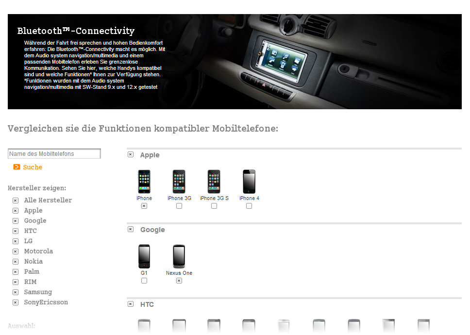 Mithilfe des Bluetooth-Beratungstools, das bei smart Bluetooth-Connectivity heißt, können User ihr Mobiltelefon aus einer Datenbank aller kompatiblen mobilen Endgeräte auswählen und erfahren, welche Geräte zu ihrem smart Modell kompatibel sind und welche Funktionen zur Verfügung stehen.