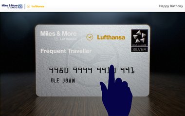 Kunden der Lufthansa, die das Vielfliegerprogramm „Miles & More“ nutzen, bekommen anlässlich ihres Geburtstages einen Videogruß, der zum einen die Gratulation übermittelt und gleichzeitig die „Miles & More“-Kundenkarte als Gestaltungselement visuell einbindet. Wir individualisieren dazu die erste im Film sichtbare FTL-Karte, indem wir je nach Kunde den Namen, seine FTL-Nummer und seine Airline auf die Karte rendern. Auf der Landingpage hat der User nun die Möglichkeit diese Karte „virtuell“ umzustoßen. Nachdem sie umgekippt ist, sieht der User einen Film, in dem ganz viele FTL-Karten nacheinander umfallen (Dominoeffekt).