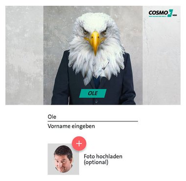 Bei der Namenseingabe wird der User aufgefordert seinen Vornamen einzugeben. Das Resultat sieht er live in einer Vorschau über der Eingabemaske. Die Darstellung des Namens ist dem Corporate Design von WDR Cosmo angepasst. Der Name ist kursiv geschrieben und mit einer grünen Farbfläche hinterlegt. Hierbei galt es eine technische Lösung zu finden, die gewährleistet, dass der Look immer gleich aussieht, also der Balken immer unter dem ganzen Namen zu sehen ist, egal wie viele Zeichen der User verwendet