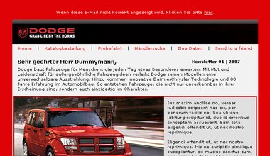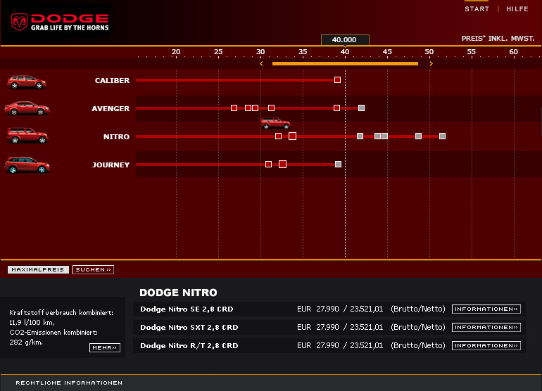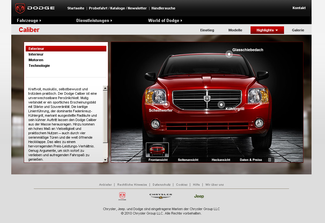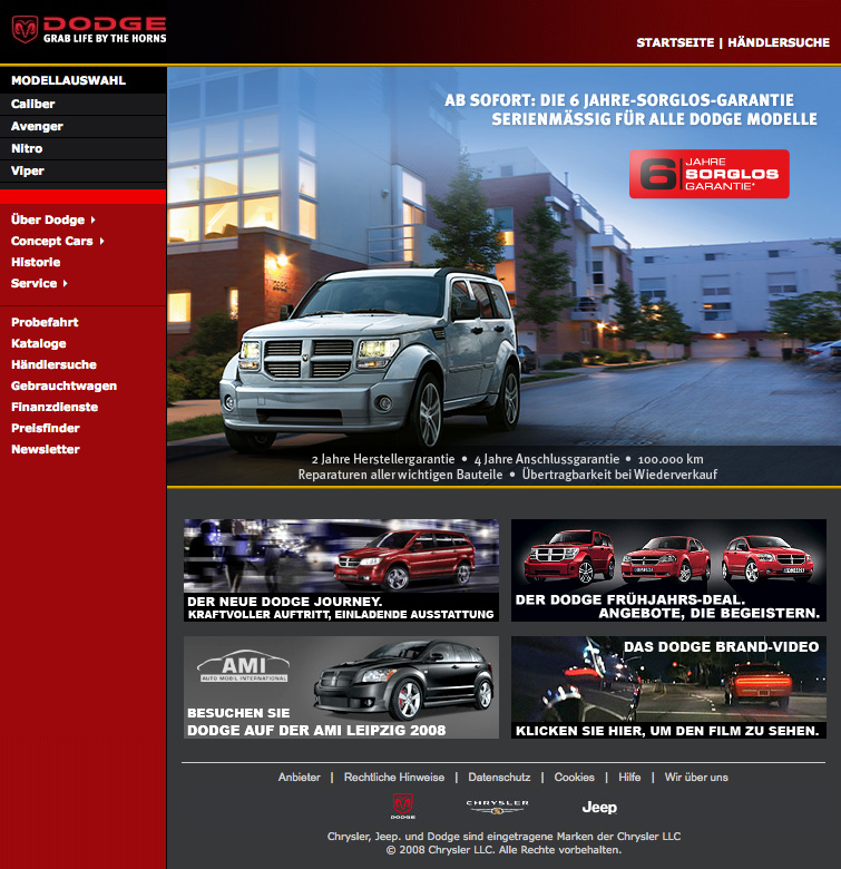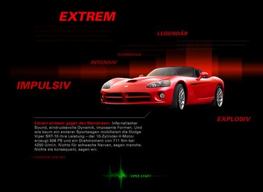 The willingly projected "macho image" (by the Dodge Viper e.g.) is acknowleged, while also streamlining the appearance to fit the overall structure and design of dodge.de into the concept formulated by the brand websites of Chrysler and Jeep.
